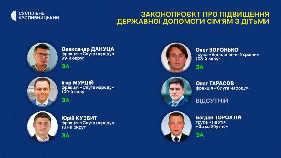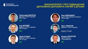 5 листопада Верховна рада ухвалила в цілому законопроєкт №13532 про підвищення державної допомоги сім'ям з дітьми. За проголосували 294 парламентарів, проти – троє, не голосували – 16, тих хто утримався – не було. Суспільне дізнавалось, як голосували представники Кіровоградської області.